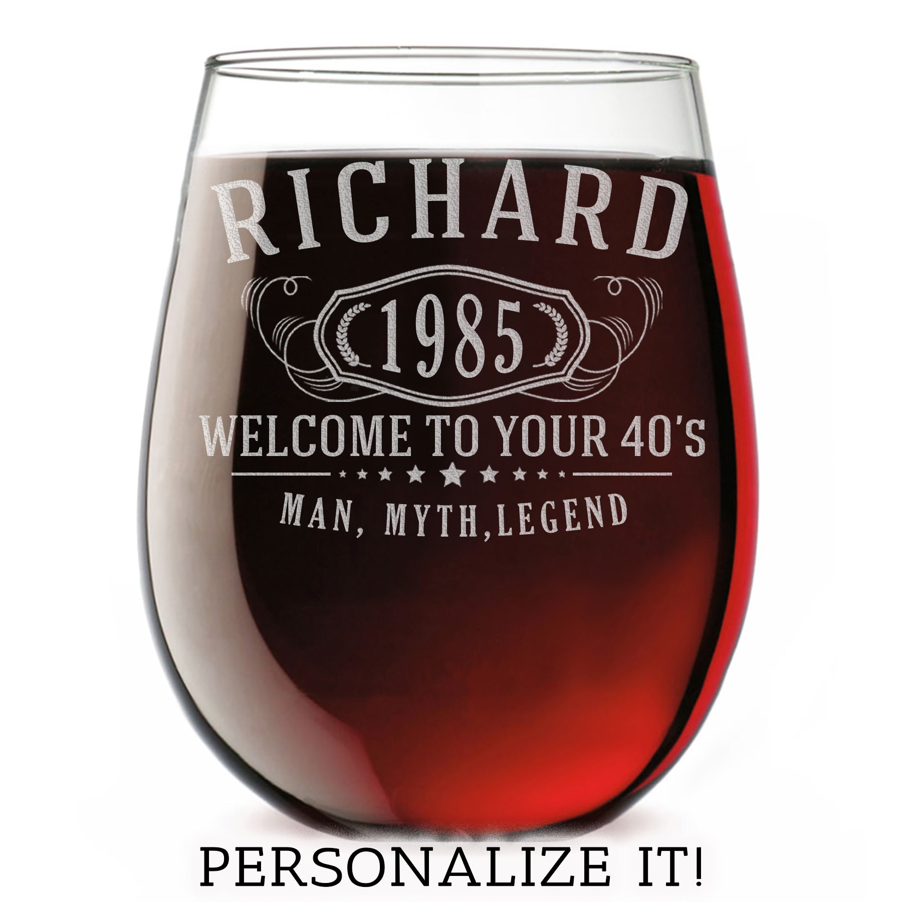Celebrate birthdays, retirements, and milestones with a custom-etched glass they’ll actually use. Our Bernard Etched Stemless Wine Glass features a bold serif name, optional year, and personalized bottom text — all deeply etched into the glass for a timeless look and feel.
