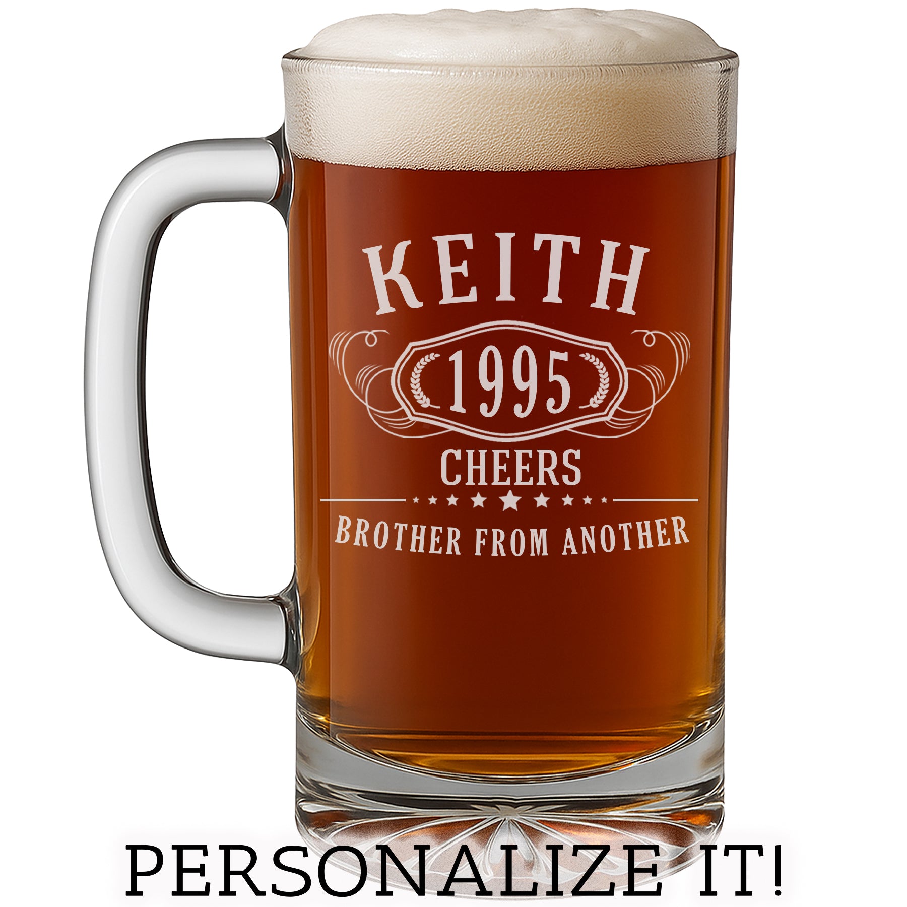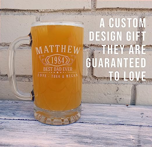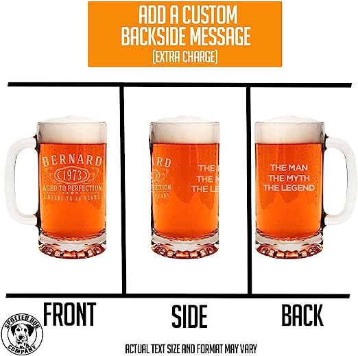Celebrate big moments with a gift that hits just right. Our Bernard Etched Beer Mug features a bold, classic design with your choice of name at the top, milestone year in the center, and a custom message at the bottom.