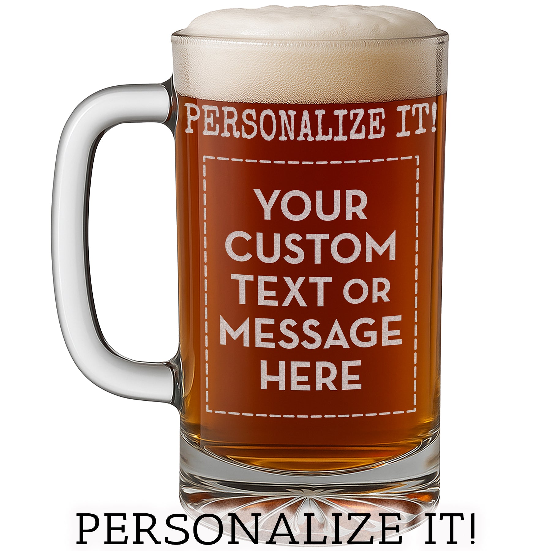 Make it personal, funny, heartfelt, or totally original. Our Custom Text Etched Beer Mug gives you the space to say whatever you want — etched permanently into a sturdy 16oz glass mug.